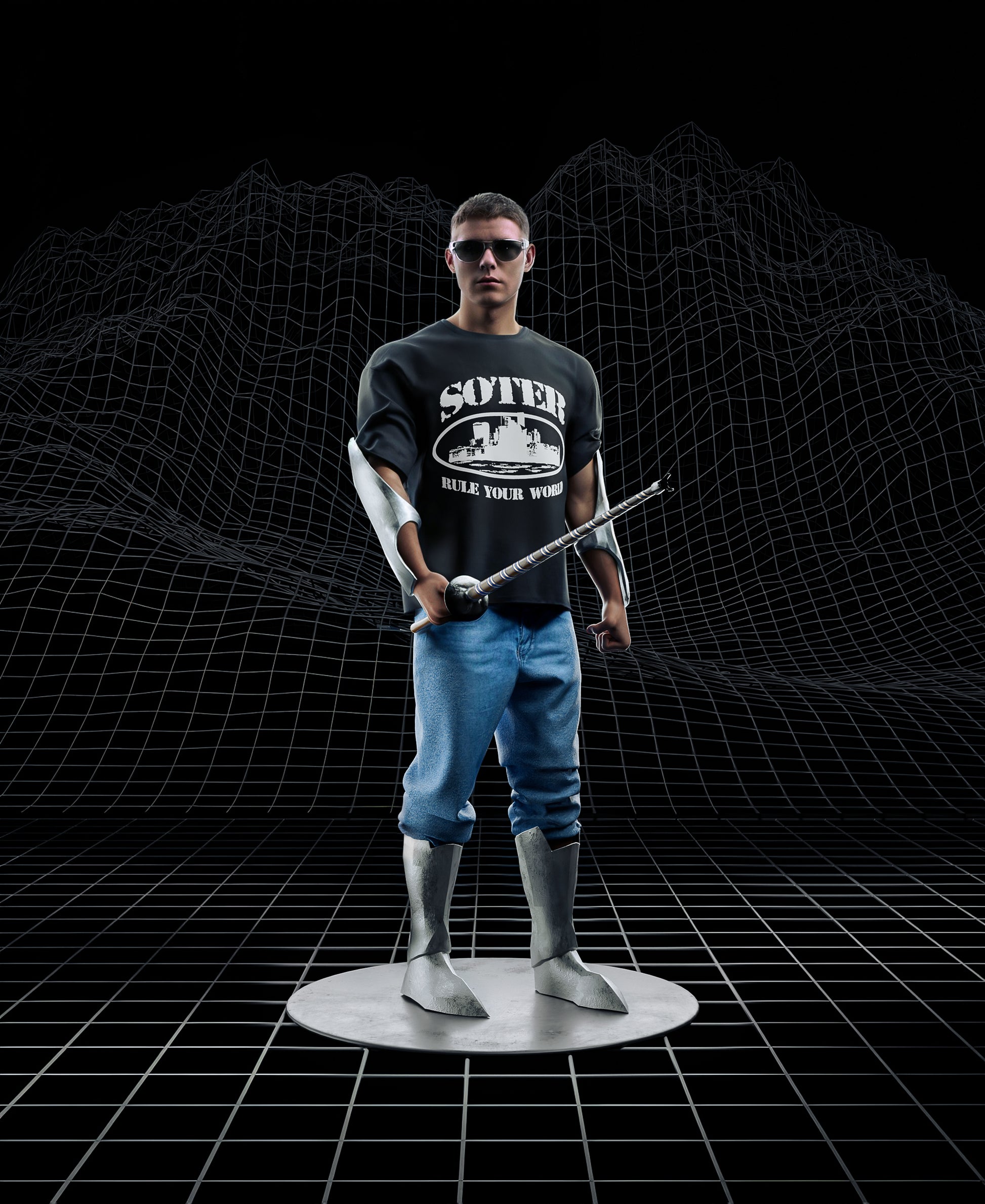 Black oversized T-shirt featuring a bold ‘SOTER’ graphic and urban skyline print with the statement 'RULE YOUR WORLD'. A powerful streetwear piece with a strong, modern attitude