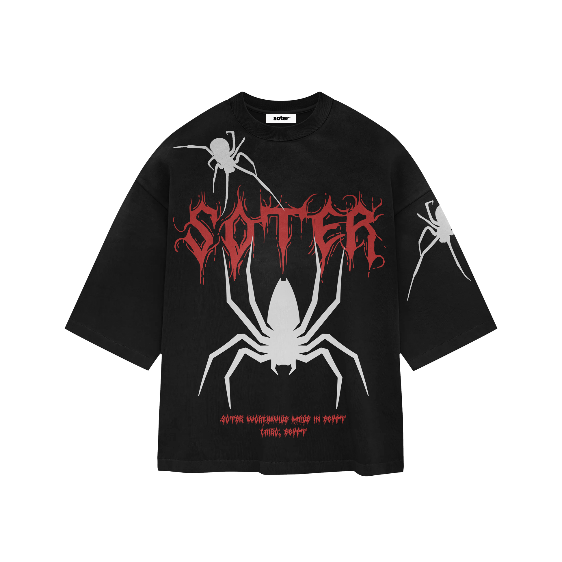 A bold black oversized tee featuring a red gothic SOTER logo with flame-like details and gray spider graphics on the front and sleeves. Made from premium cotton, it offers comfort and a strong streetwear aesthetic.